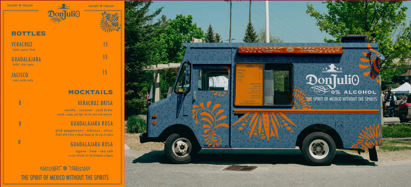 --> A Don Juli0 truck providing mocktails and bottles of Don Juli0 on the go! Brings people into the experience of the spirit of Mexico without the spirits & travel stress.
